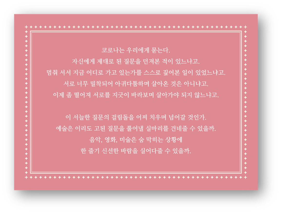 코로나19로 인해 접하기 어려웠던 문화예술을 통해 사색과 힐링의 시간을 제공하고자