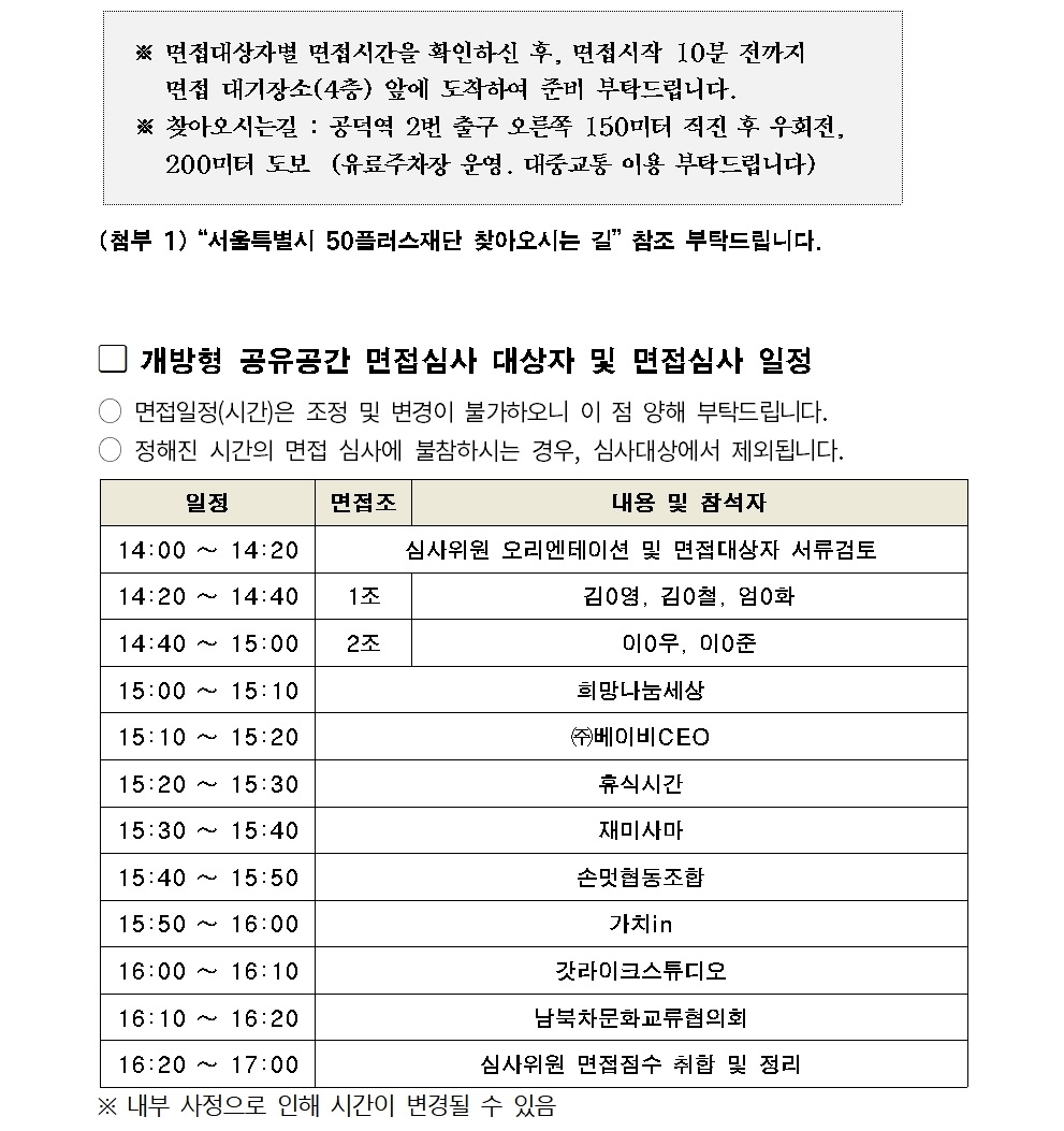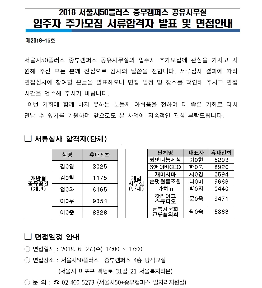 [중부]2018 서울시50플러스 중부캠퍼스 공유사무실 입주자 추가모집 서류합격자 발표 및 면접안내