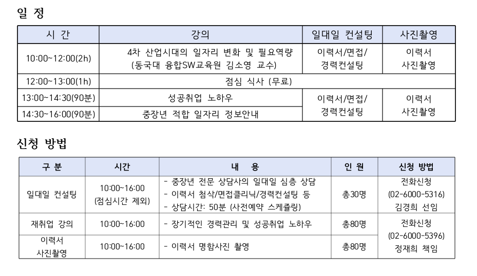 컨설팅은 10월 11일(목) 10~16시에 삼성동 코엑스에서 진행되며 취업 노하우, 중장년 적합 일자리 정보 등의 강의와 이력서 사진 촬영도 함께 진행합니다.