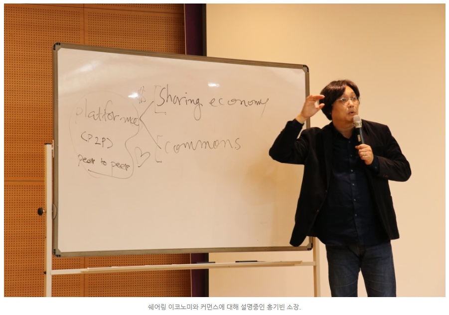 ‘에어비앤비’나 ‘우버’ 같은 서비스로 우리에게 익숙해진 ‘공유경제’라는 말이 사실은 셰어링 이코노미(Sharing Economy)와 커먼스(Commons)로 나뉜다는 다소 전문적인 이야기로 강의가 시작되었다. 앞서 말한 두가지의 공통점을 말하자면 바로 플랫폼을 이용한 경제모델이라는 것이다. 그러나 셰어링 이코노미는 결국 수익창출이 목적이고, 커먼스는 좋은 삶이 목적이기 때문에 플랫폼을 가진 공유경제라 하더라도 두가지를 분리해서 생각해야 한다고 한다.