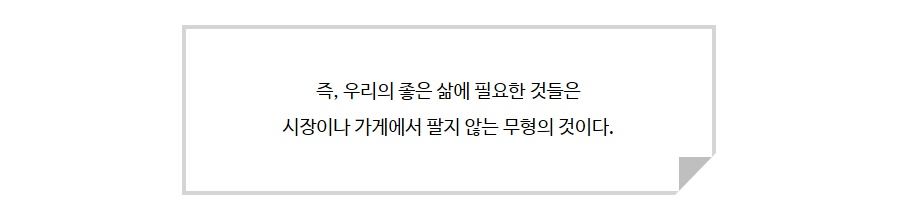 '셰어링 이코노미'와 '커먼스'는 궁극적으로 추구하는 것이 다르다. 아무리 자본주의 사회라고 하나 좋은 삶에 필요한 것을 돈으로 다 조달할 수 없다. 좋은 삶을 위한 좋은 배우자의 경우를 보자. 결혼 시장이라는 말이 있긴 하지만 좋은 배우자란(경험해 보셨겠지만), 맞춰가면서 또 싸워가면서 만들어 가는 것이라 시장에는 원래 없는 것이다. 좋은 교육도 마찬가지다. 그것은 열정적인 교육자, 학생, 학부모가 서로 주고받으면서 만들어지는 것이다. 그러한 것들은 원래 시장에는 없었다. 미리 만들어져 있지 않았으니 상품화되어 있지 않다.
