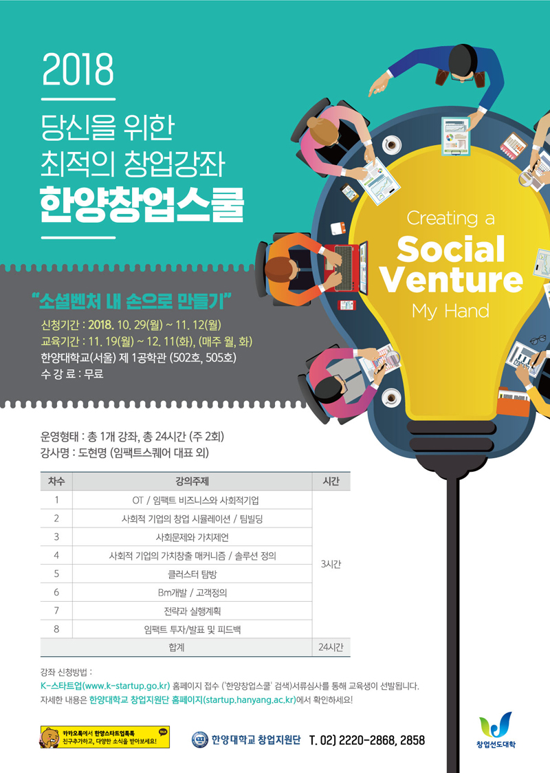 한양대학교 창업지원단은 11월 12일(월)까지 한양창업스쿨 '소셜벤처 내 손으로 만들기' 교육생을 모집합니다.