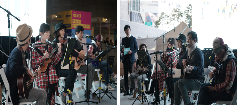 축제장 입구에 위치한 ‘마을방송국’에서는 오디션을 통해 선발된 오플밴드와 날꽃뺀드의 흥겨운 버스킹 공연을 볼 수 있었다.