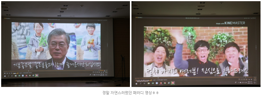 시작은 서하경님의 사회로 ‘추억 나눔 영상 관람’으로 시작되었다. 사회 각계각층의 유명인들이 이 과정의 종강을 축하해 주는 패러디 영상이었다.