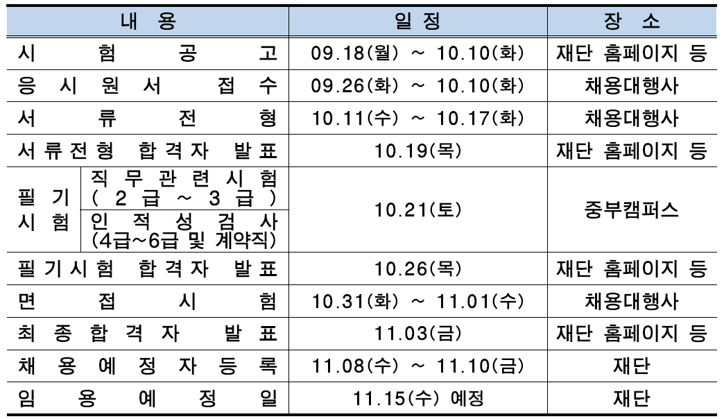 ○ 필기시험(직무관련시험‧인적성검사) : 개별통보 및 재단 홈페이지 공고