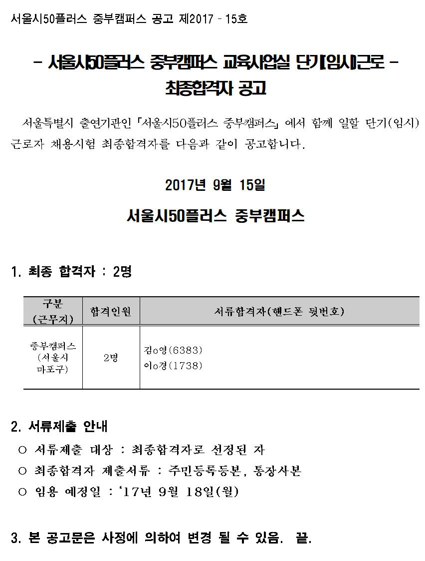 [재단][중부] 교육사업실 단기(임시)근로 최종합격자 공고
