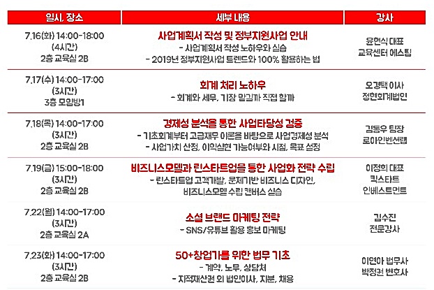 강의·실습 내용은 사업계획서 작성 및 2019년 정부지원사업 트렌드와 활용, 회계, 경제성 분석 및 사업 타당성 검증, 사업계획서 작성 노하우, 비즈니스모델과 불확실한 창업 환경에서 지속적 혁신을 실현할 수 있는 린스타트업(Lean Startup)을 통한 사업화 전략, 소셜브랜드(SNS·유튜브 등) 마케팅 전략, 계약, 노무, 지적재산권 등 법무 기초 등으로 총 19시간이다.