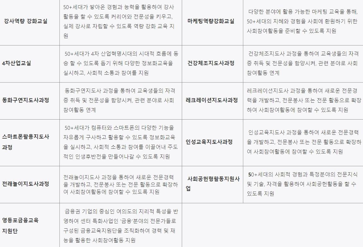 센터마다 인생설계아카데미, 인생2막학교,  STAR 인생길찾기교실인생이모작 입문교실과 같은 이름으로 비슷한 고민을 공유하는 50+세대가 모여 부담 없이 수강할 수 있는 생애설계 과정을 운영하고 있습니다. 각 센터는 인생강좌, 인문학 교실, 북콘서트, 은퇴설계콘서트와 같이 명사의 식견을 듣거나 교양 강의로 지난 삶을 성찰하고 미래를 그려볼 수 있는 프로그램도 개설합니다.  건강, 재무, 가족 관계, 사회공헌 등과 관련된 주제별 프로그램도 필요에 따라 수강할 수 있습니다.