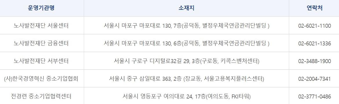 서울에는 2019년 현재 5개소의 중장년 일자리희망센터가 운영되고 있습니다. 노사발전재단(3개소), (사)한국경영혁신 중소기업협회(1개소), 전경련 중소기업협력센터(1개소)가 운영을 맡고 있습니다. 중장년 일자리희망센터는 센터마다 운영 주체도 다르고, 인터넷상의 정보만으로는 일목요연하게 기관별 프로그램 특징, 프로그램 상세 내용을 파악하기 쉽지 않습니다. 홈페이지 등에 기재된 연락처로 문의해 본인이 어떤 도움을 받을 수 있는지 알아보는 것이 좋습니다.