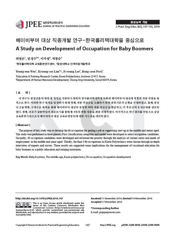 • 중장년의 취업 및 창업 활성화를 지원하기 위해 한국폴리텍대학에 특화된 베이비부머 대상 직종개발을 목적으로 한 연구.