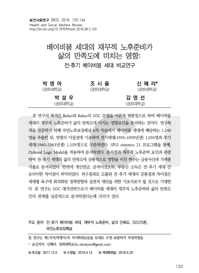 SOC 모델을 바탕으로 베이비붐 세대의 재무적 노후준비가 삶의 만족도에 미치는 영향요인을 분석함. 국민노후보장패널 6차 자료에서 베이비붐 세대에 해당하는 2,140명을 추출한 뒤, 연령의 이질성에 기초하여 전기세대(1955~1959년생) 1,035명과 후기세대(1960~1963년생) 1,105명으로 구분함.