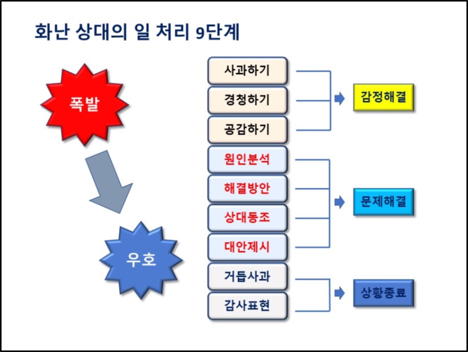 즉, 화난 상대의 입장을 경청하고 공감하는 것이 첫 번째 할 일이다.