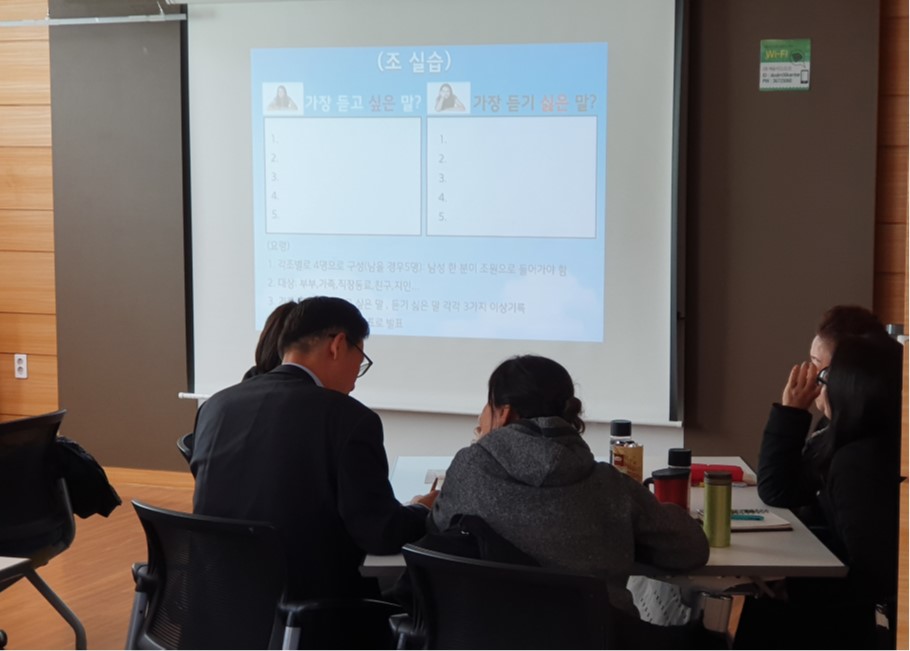 조별로 「말의 힘」과 관련된 토의 모습이 진지하다.