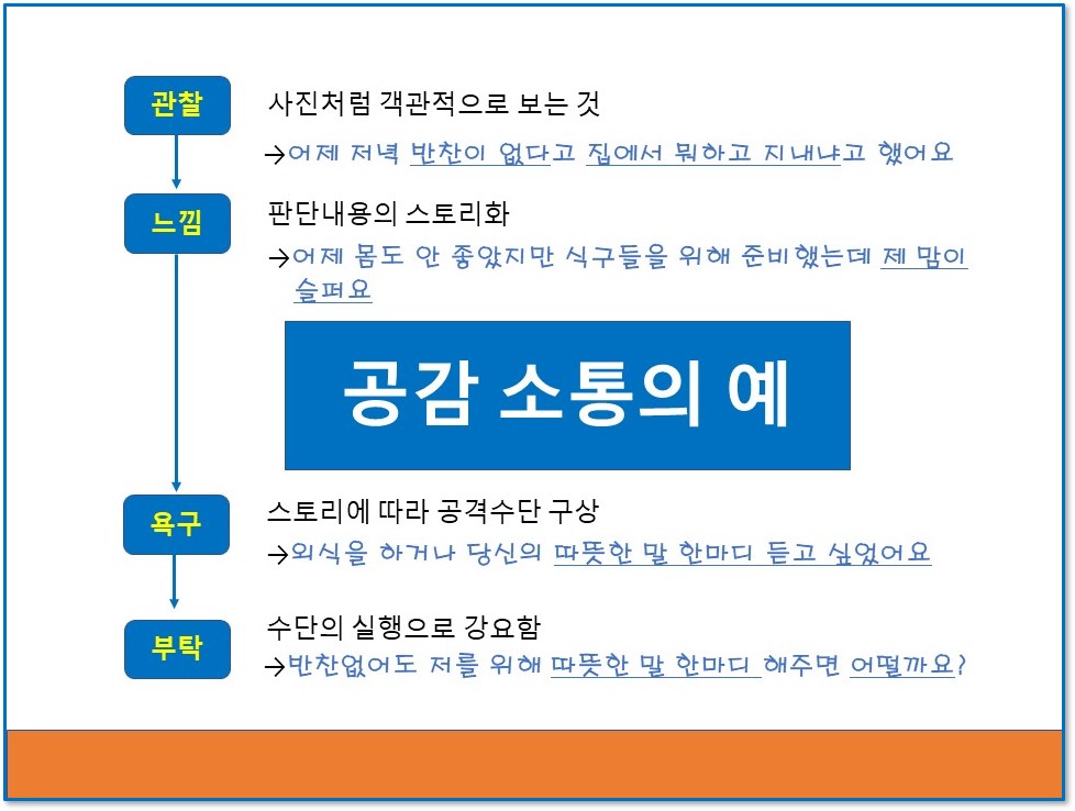 반면, 공감소통에서 등장하는 관찰-느낌-욕구-부탁의 Key-Word와 사례는 다음과 같다.