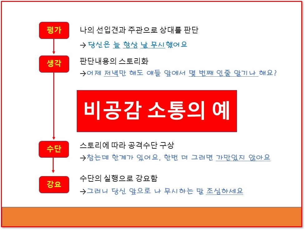 비공감 소통에서는 「평가」,「생각」,「수단」,「강요」가 앞선다.