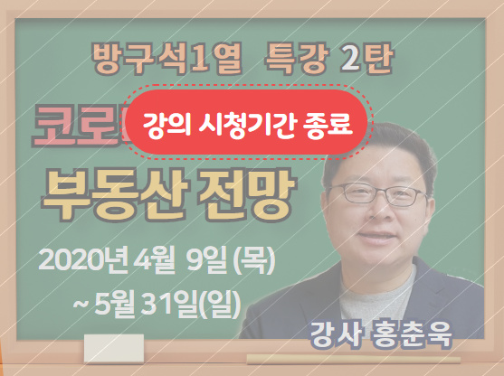 방구석 1열 온라인강의 2탄 [코로나19영향 부동산시장 전망]은 4/9(목)~5/31(일) 까지만 시청 가능합니다.