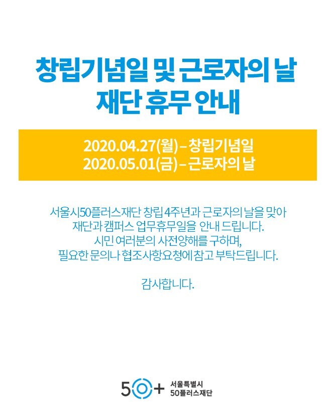 [재단]창립기념일 및 근로자의 날 재단 휴무 안내(4/27, 5/1)