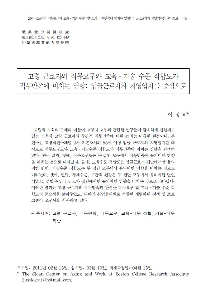 • 55세 이상 임금 근로자와 자영업자를 대상으로 직무 요구도와 교육·기술 수준 적합도가 직무 만족에 미치는 영향을 탐색한 연구.