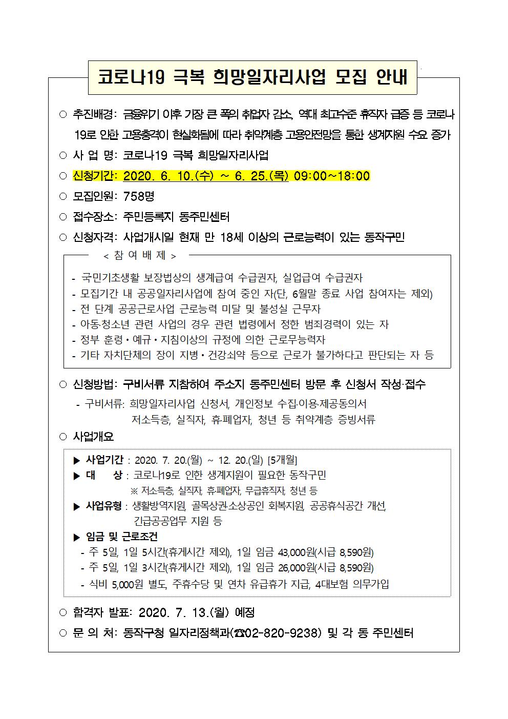 [동작](동작구청 일자리정책과) 코로나 19 극복 희망 일자리사업 모집 안내