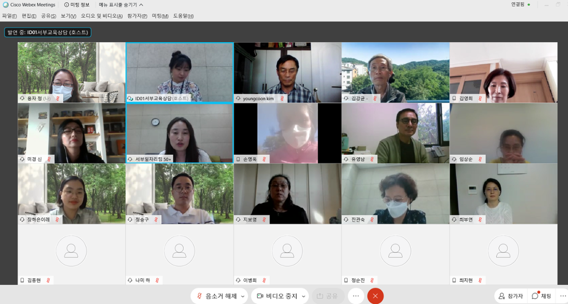 마침 지난 9월 22일, 서울시50플러스 서부캠퍼스 4층 흥얼교실에서 <커뮤니티를 위한 온라인 플랫폼 활용 워크숍>이 웹엑스(webex)로 진행되었습니다. 호스트를 맡은 커뮤니티 담당 김경남 PM이 하루 전, 워크숍 진행을 위한 사전 점검까지 할 만큼 열정을 보인 워크숍인데요. 미팅룸에 신청자들이 접속하고, 구현정 팀장의 인사말이 있은 후 협동조합 빠띠(parti)의 민주주의 활동가 장하은(이레) 씨가 커뮤니티 활동에 유익한 온라인 플랫폼 활용에 대해 알려주었습니다. 빠띠가 먼저 경험한 것을 공유하는 거라는 예쁜 인사말과 함께요.