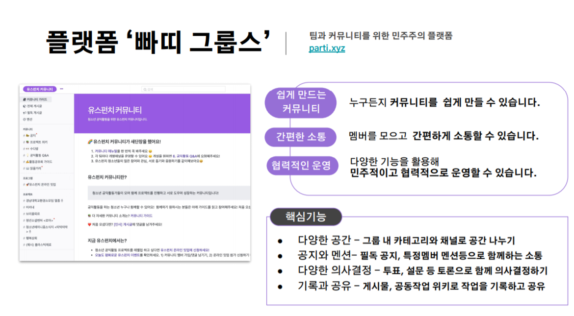 삶의 전환을 실험하는 시민 커뮤니티(커먼즈필드 제주). 성평등 정책을 만드는 청년 커뮤니티(버터나이프크루), 국내 최초 이슈 프로젝트 정당 (나는알아야겠당). 제로웨이스트를 지향하는 자발적 시민 커뮤니티 (쓰레기덕질)의 활동사례도 공유했습니다.