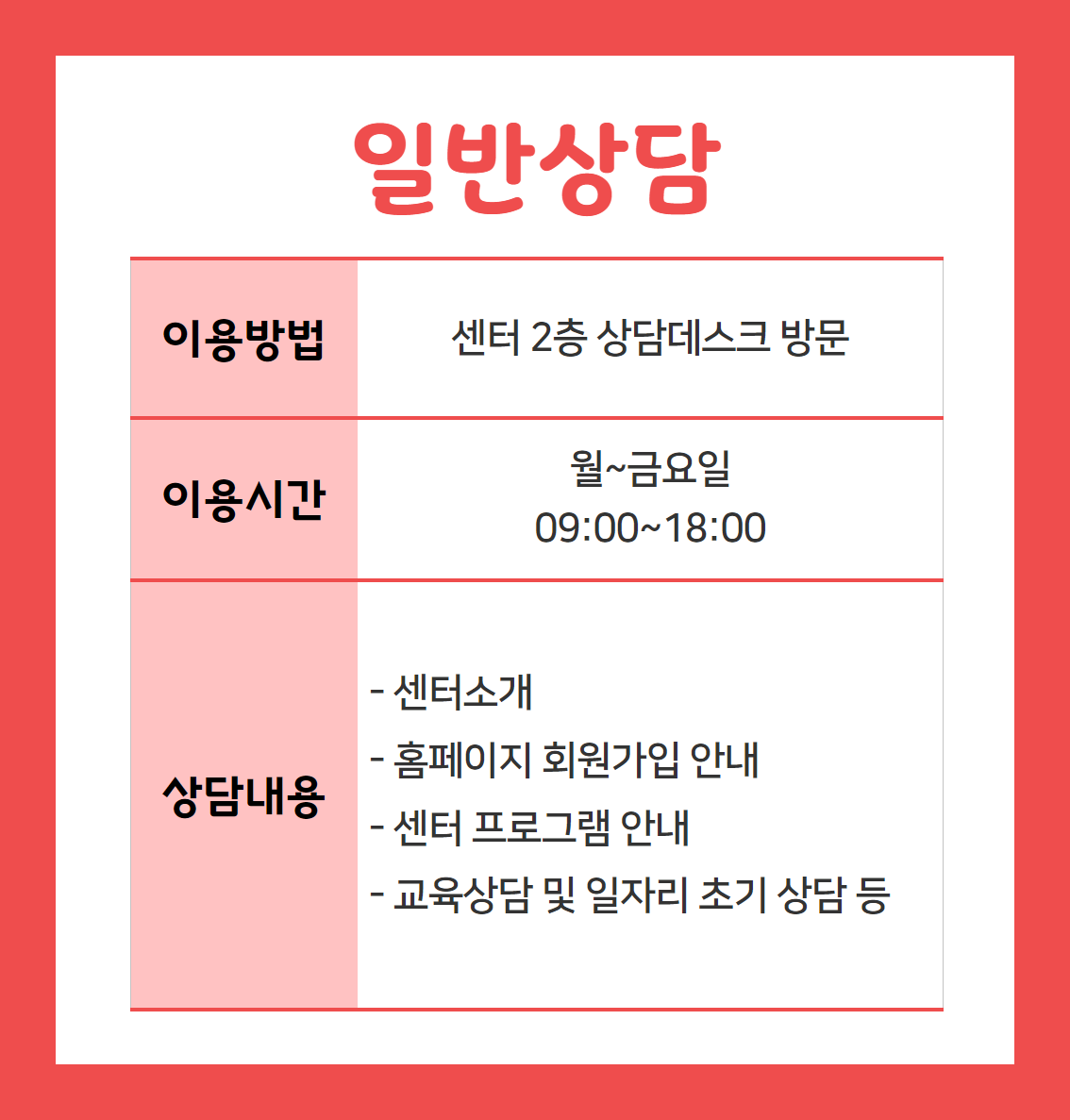센터 초기 방문자 및 회원을 대상으로 센터 이용 전반에 대한 일반상담과