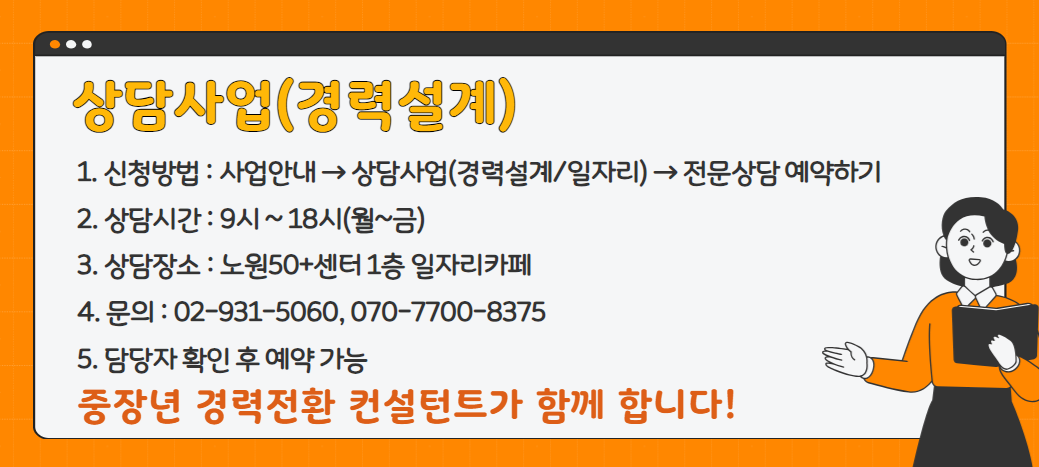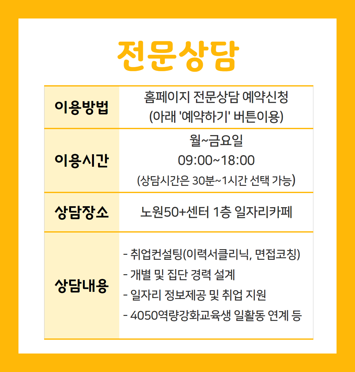 취업희망자 대상으로 경력설계, 일자리 상담 등 개인 맞춤형 전문상담을 진행합니다.