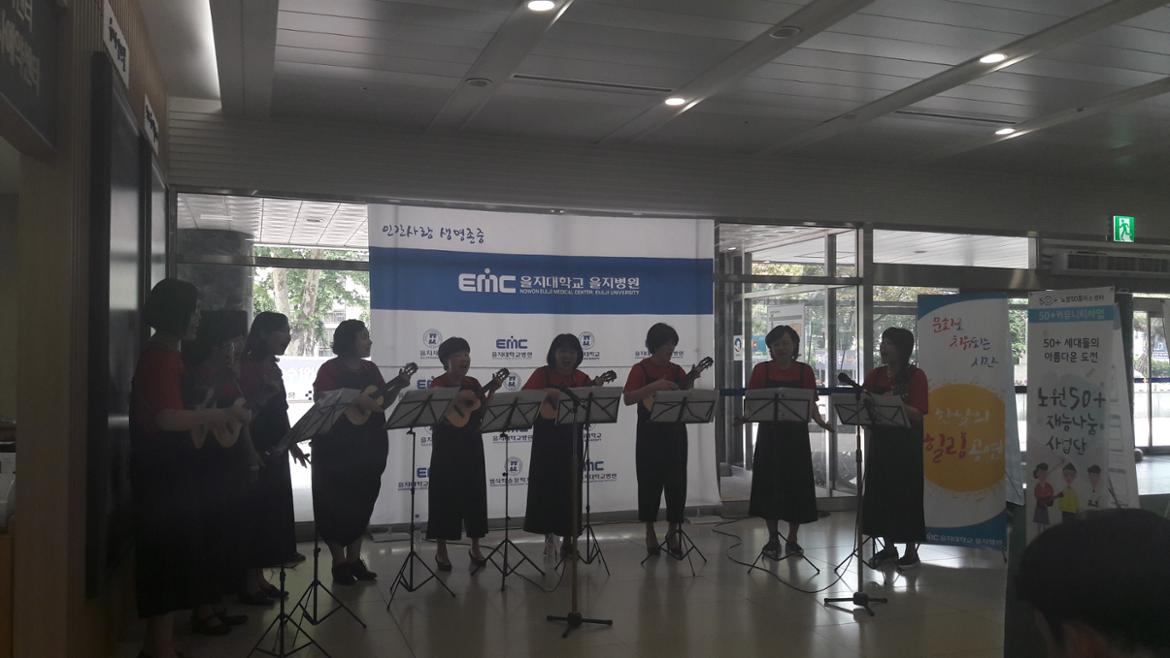 나른한 오후시간대에 준비된 50+재능나눔사업단 우쿨렐레 팀들의 노래와 연주는 병원의 공기를 바꿨습니다.