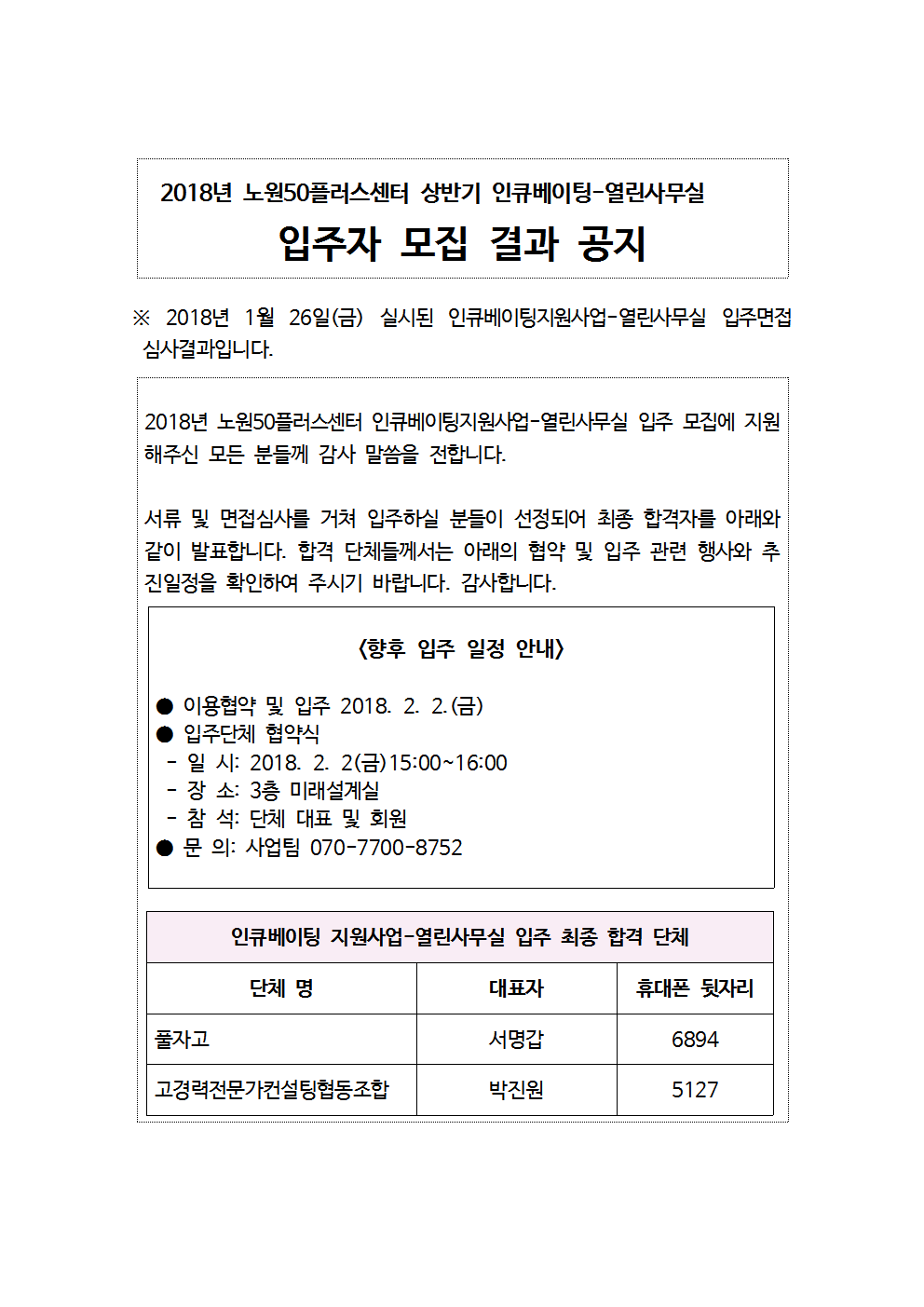 [발표] 노원50플러스센터 2018년 상반기 인큐베이팅지원사업-열린사무실 최종합격 단체