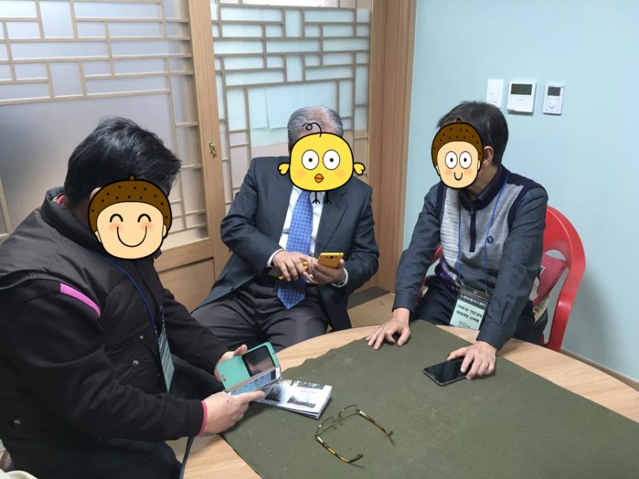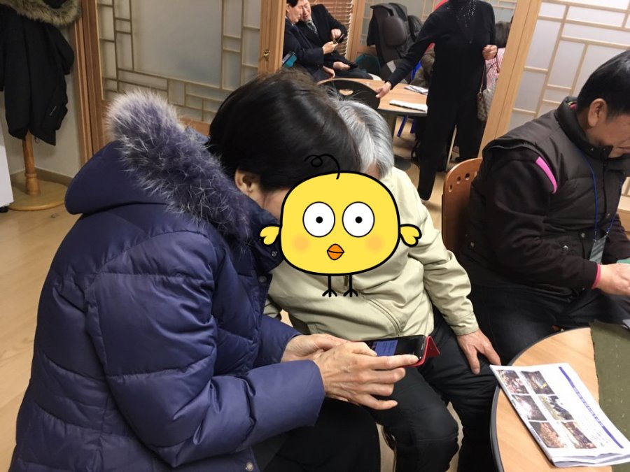 경로당에 모여계신 어르신들과 함께 열심히 스마트폰을 들여다 보고 계신