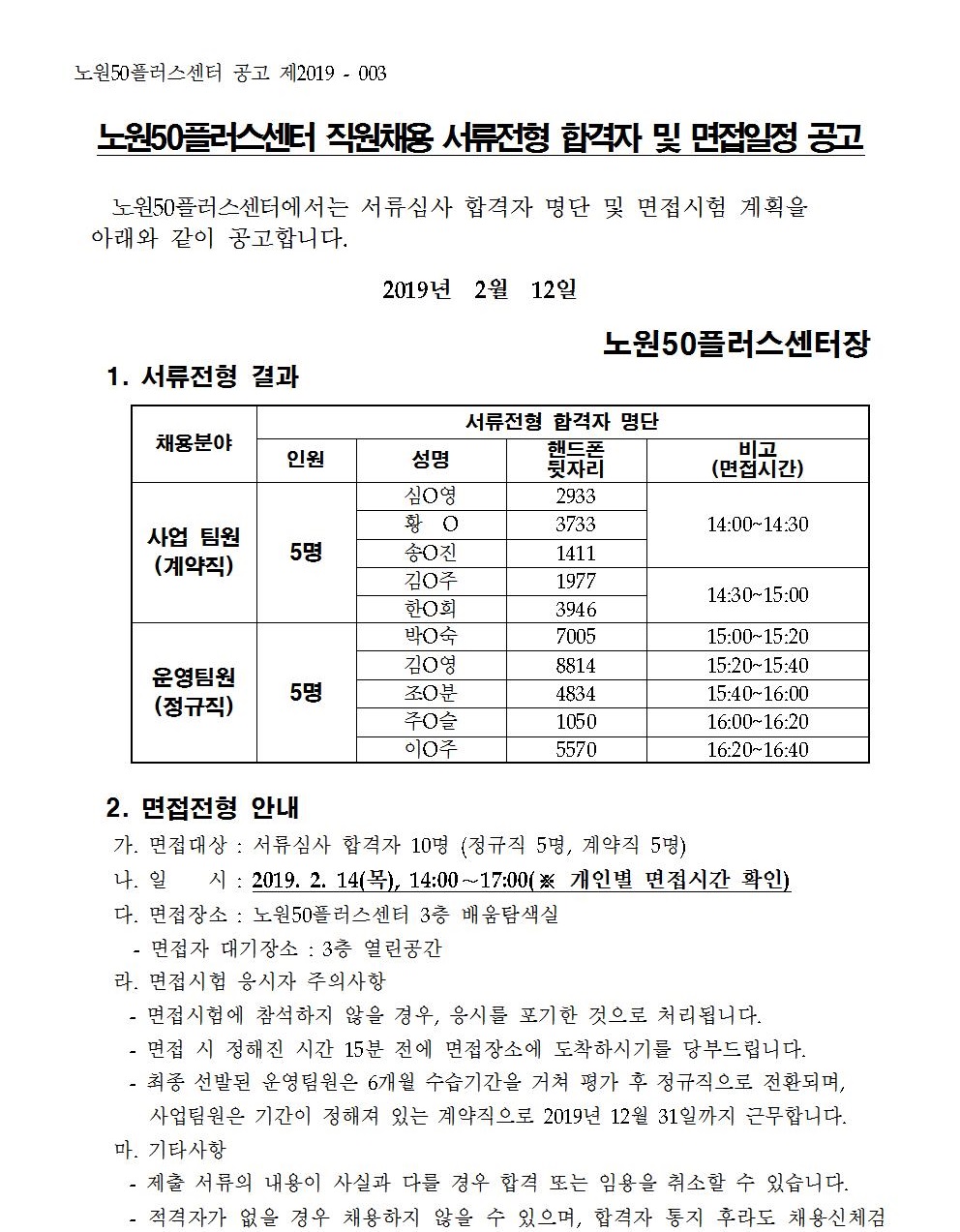 서울시 노원센터 | [채용] 노원50플러스센터 직원채용 서류전형 합격자 및 면접일정 공고