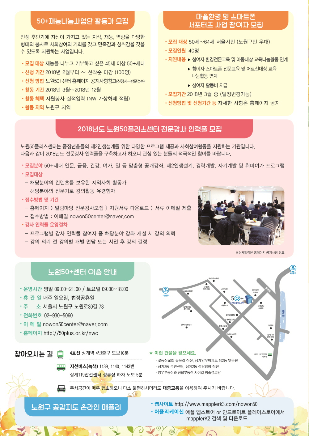 노원50플러스센터 (우 01697 )서울시 노원구 노원로 30길 73 사업자등록번호 : 305-82-86739 대표자 : 장부경