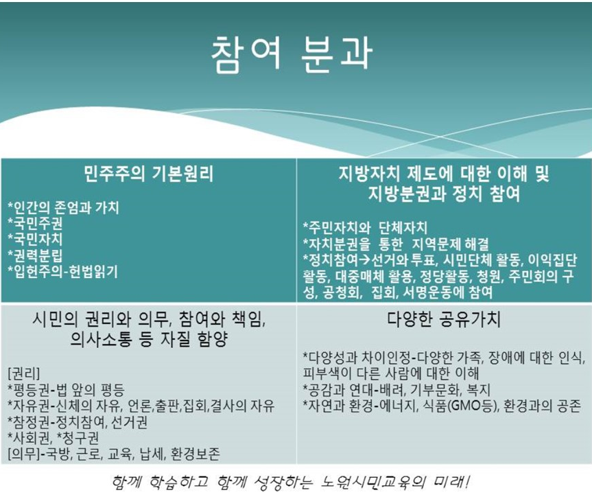 4개분과(민주주의 기본원리/ 지방자치제도의 이해/ 시민의 권리와 의무/ 다양한 공유가치)에