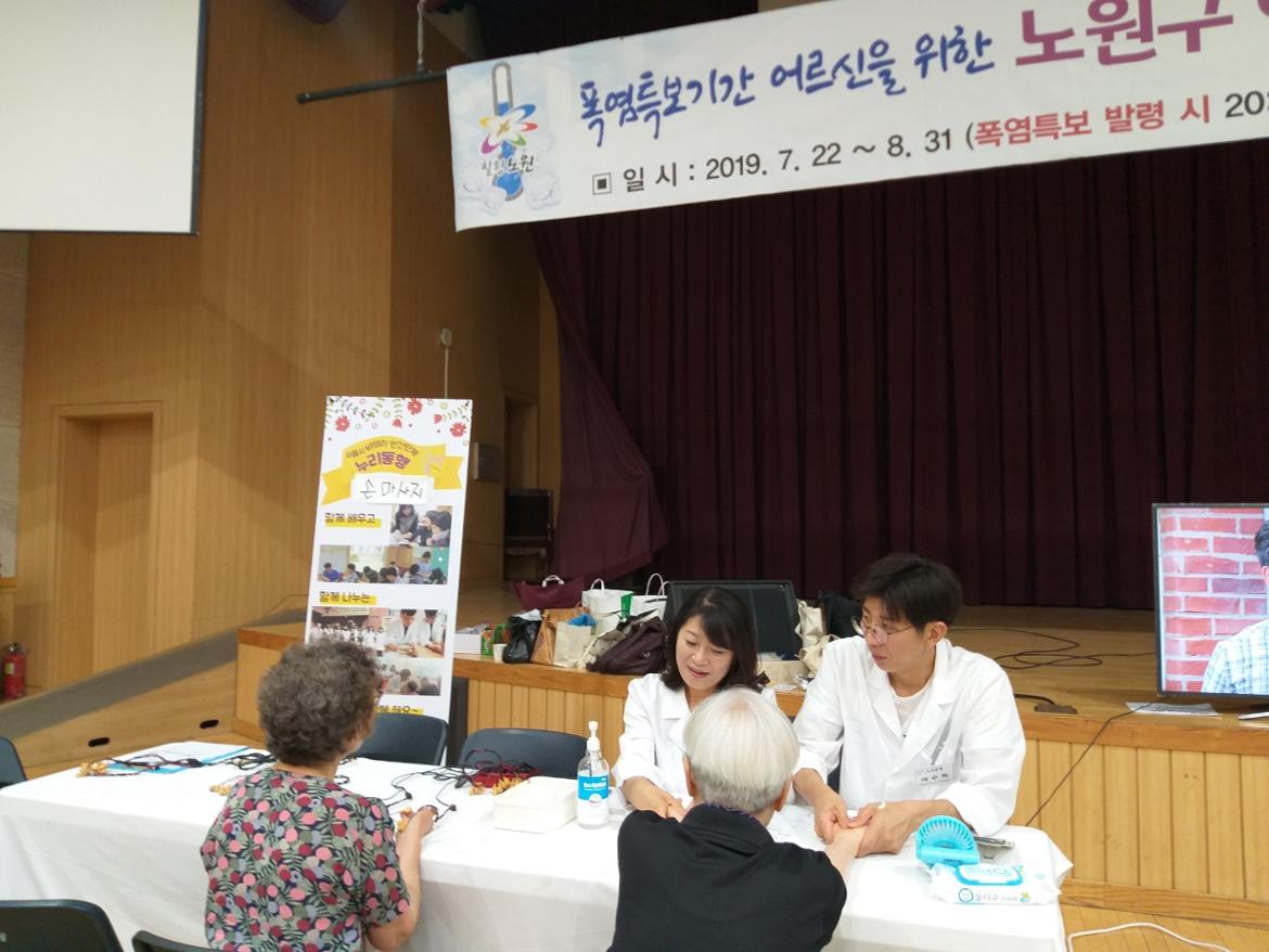야간 무더위쉼터에서  손마사지 활동하였습니다.