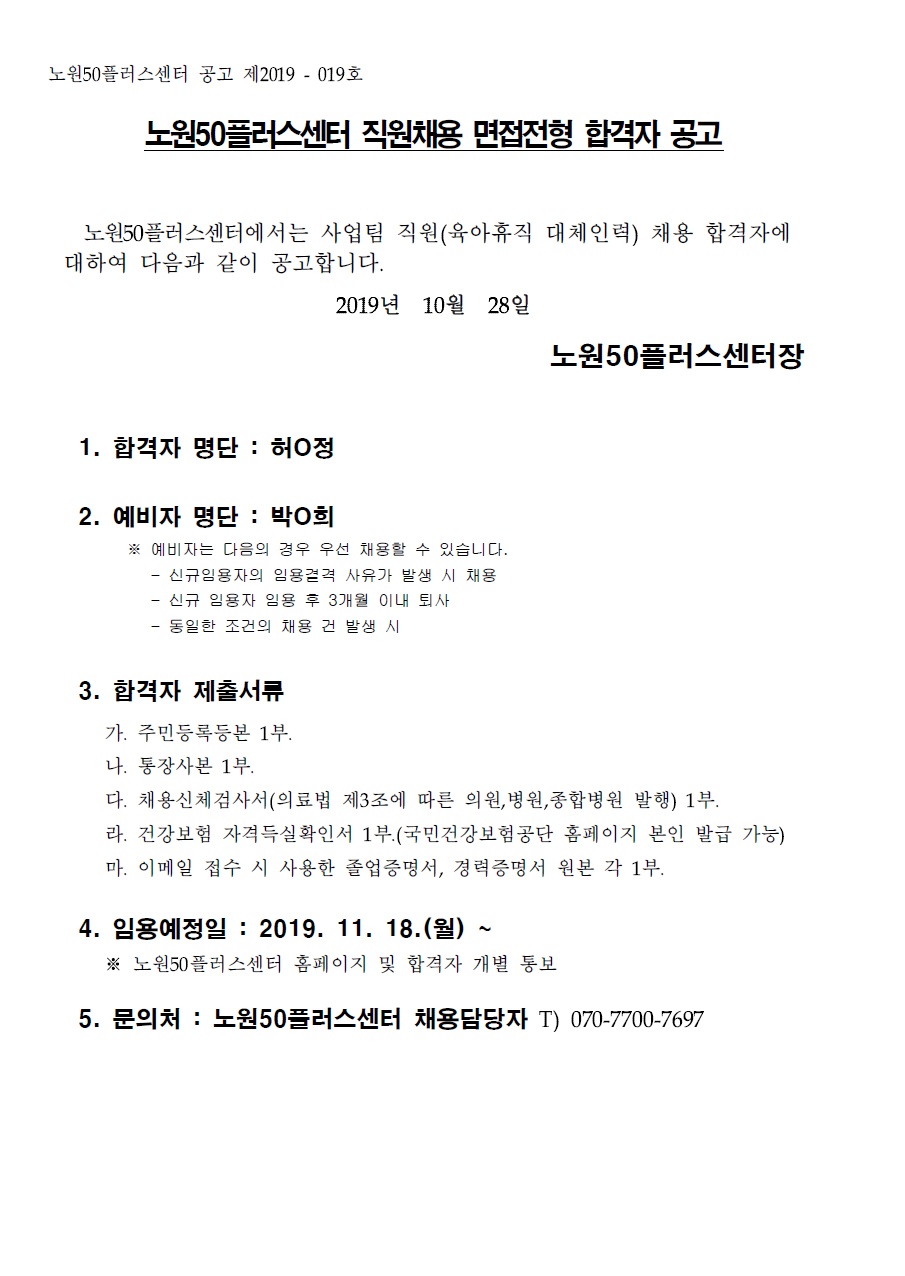 [채용]노원50플러스센터 직원(육아휴직 대체인력) 채용 면접전형 합격자 공고