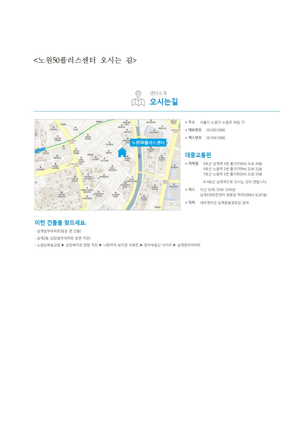 노원50플러스센터 (우 01697 )서울시 노원구 노원로 30길 73 사업자등록번호 : 305-82-86739 대표자 : 장부경