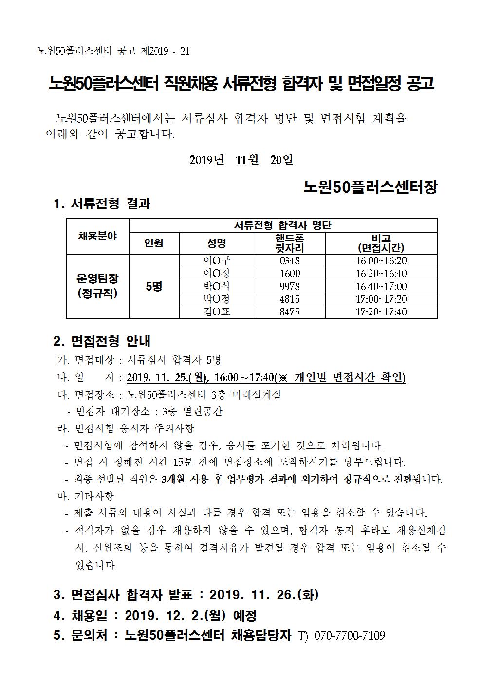 서울시 노원센터 | [채용] 노원50플러스센터 직원채용 서류전형 합격자 및 면접일정 공고