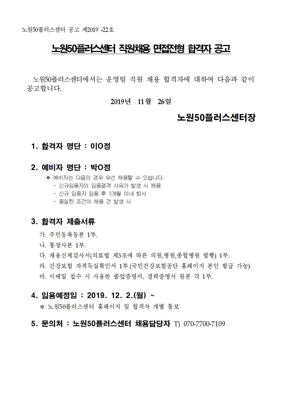 [채용] 노원50플러스센터 직원 면접전형 합격자 공고