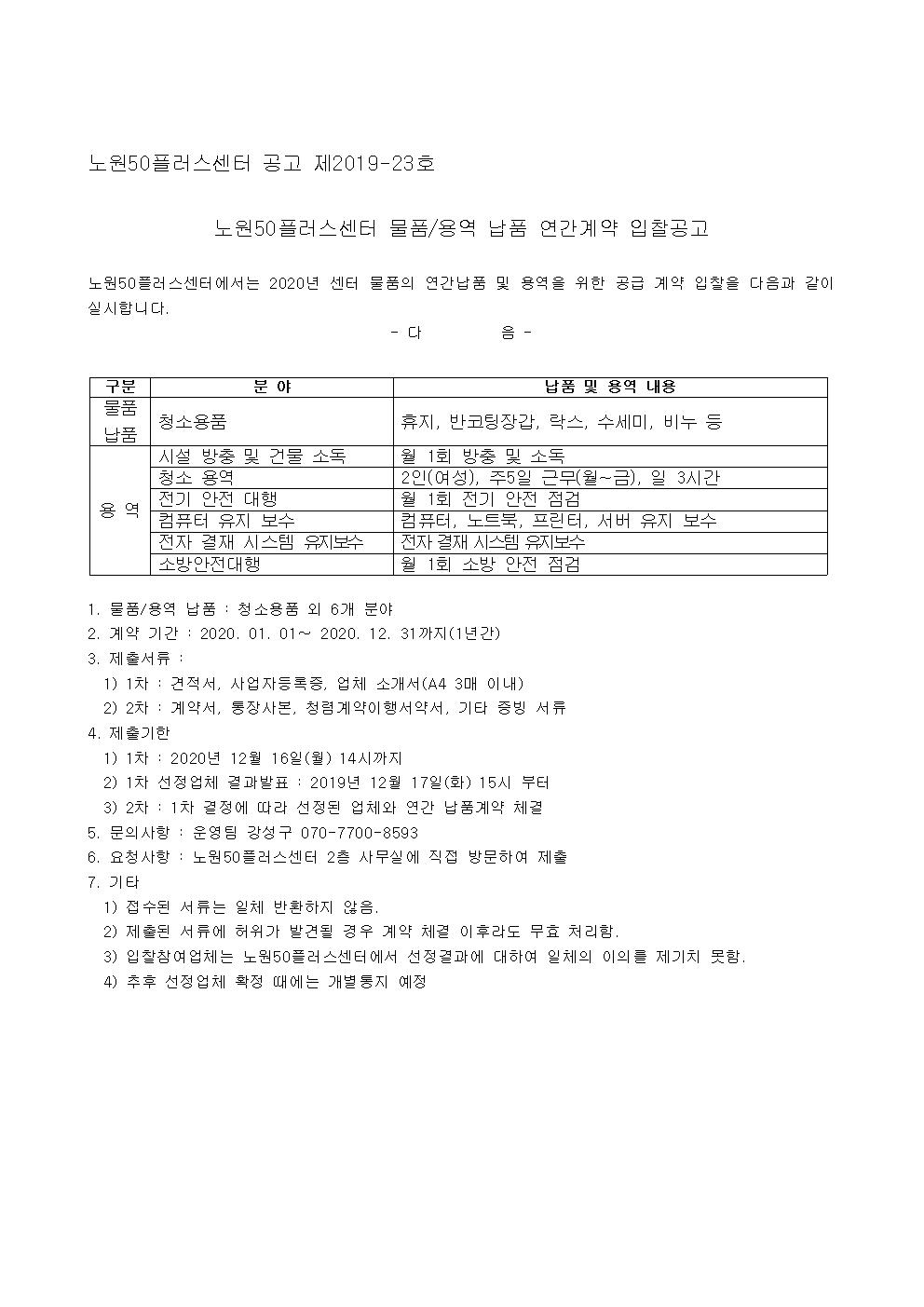 2020년 노원50플러스센터 물품/용역 납품 연간계약 입찰 공고