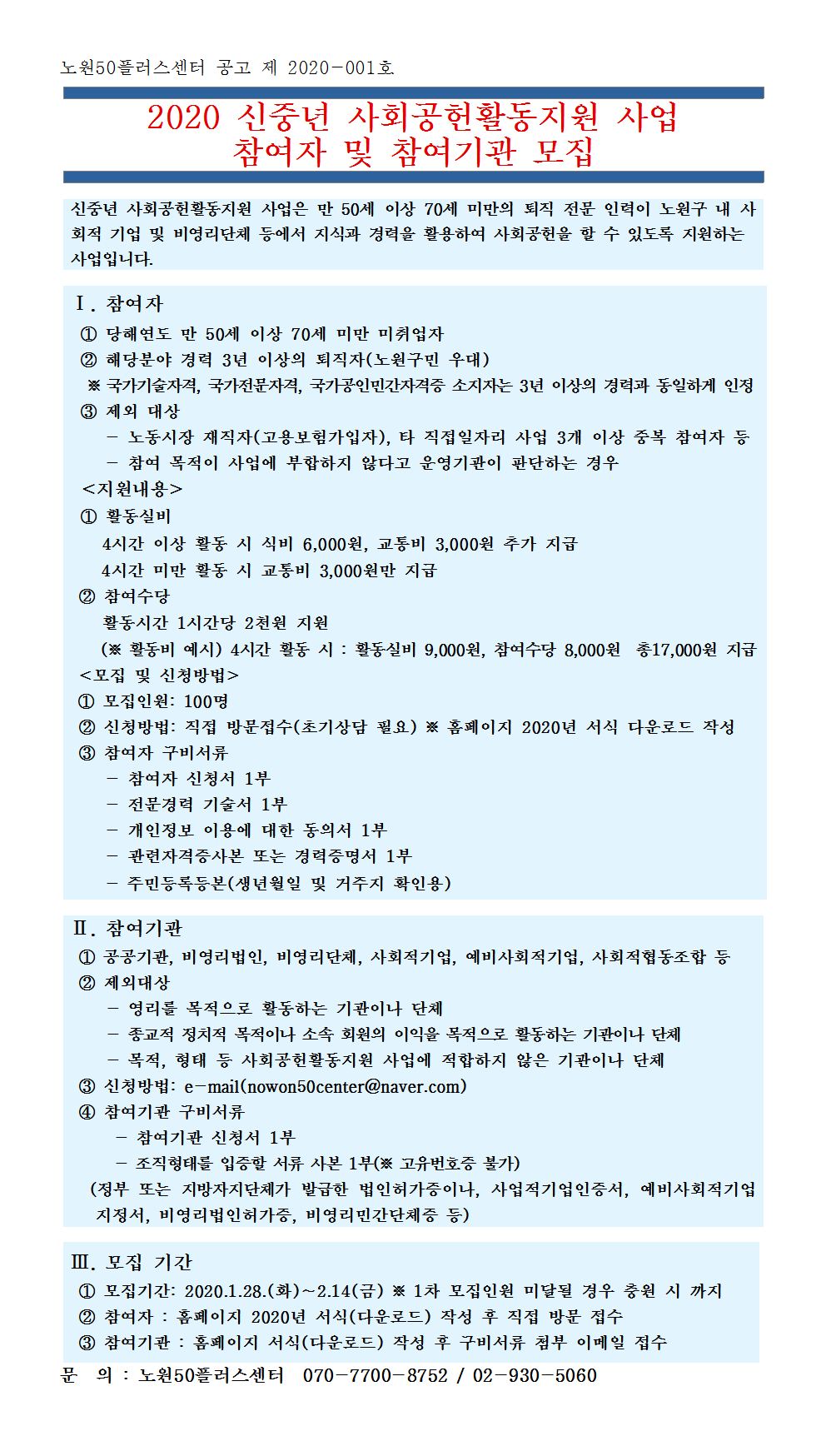서류접수 : 2020년 1월 28일부터(사전접수 불가)