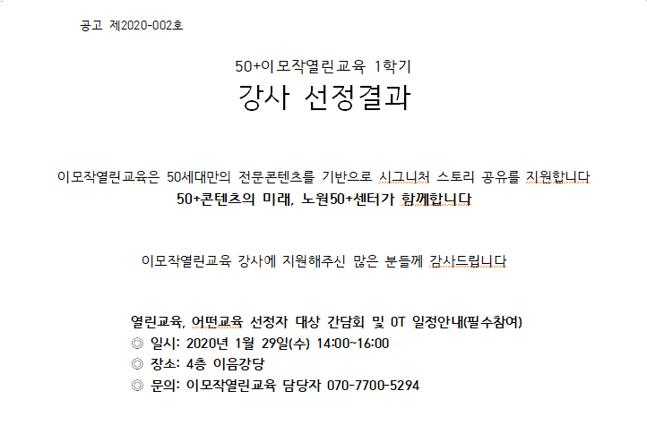[발표]50+이모작열린교육 1학기 강사 선정결과