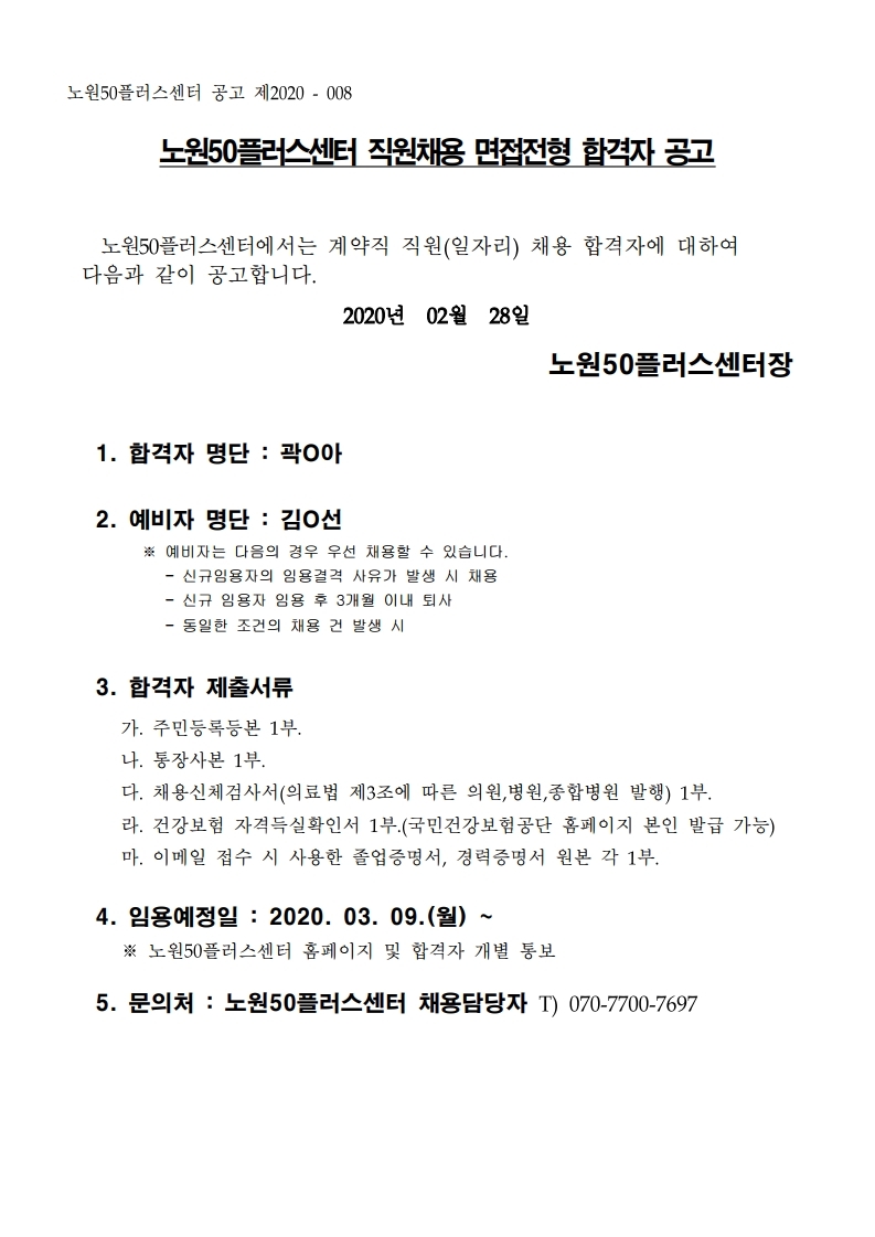 서울시 노원센터 | [채용]노원50플러스센터 계약직직원(일자리) 채용 합격공고
