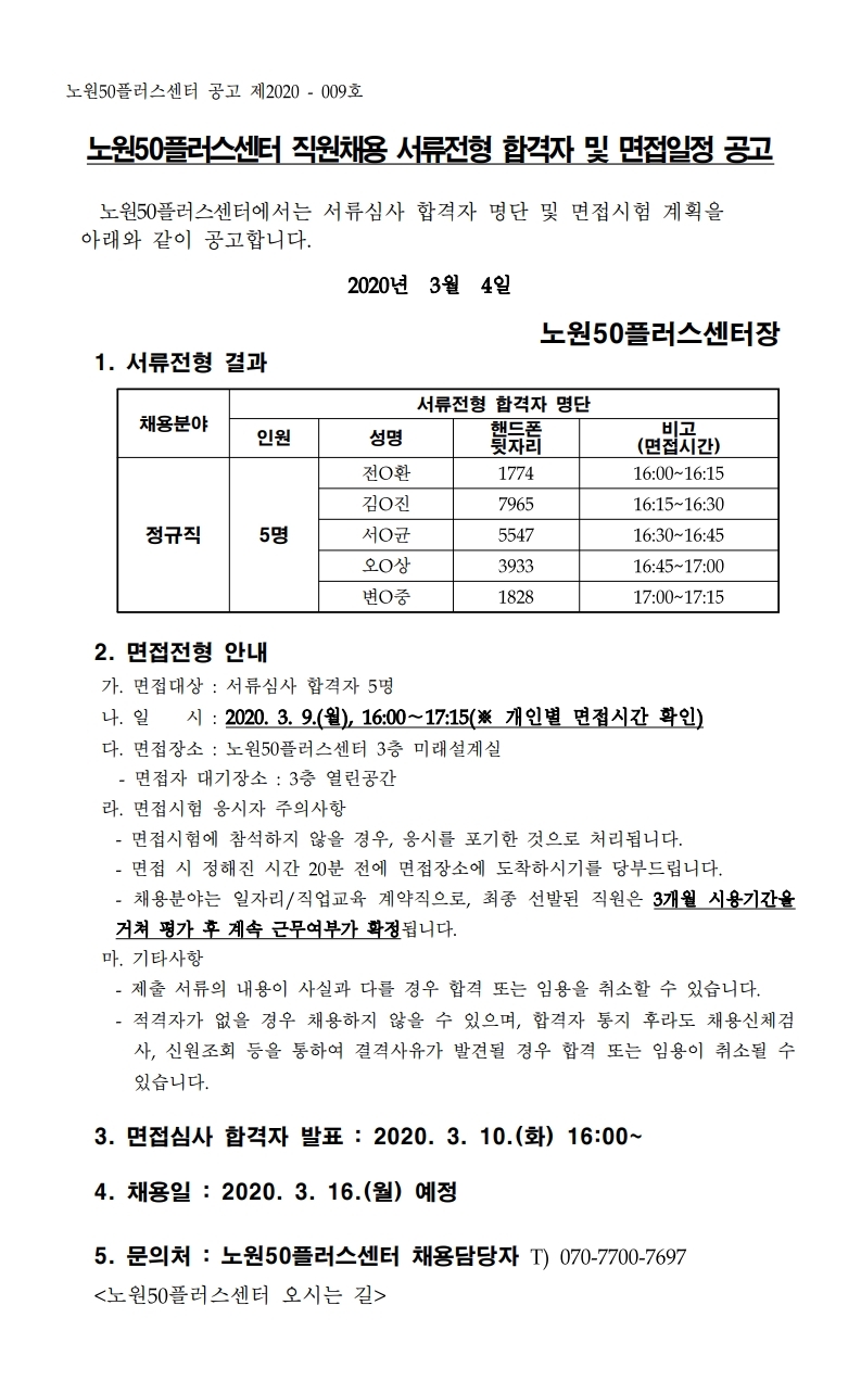 서울시 노원센터 | [채용]노원50플러스센터 직원채용 서류전형합격자 및 면접일정 공고