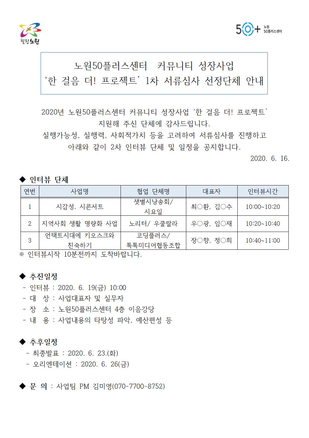 2020커뮤니티 성장사업 '한걸음 더! 프로젝트' 1차 서류심사 선정단체 공고