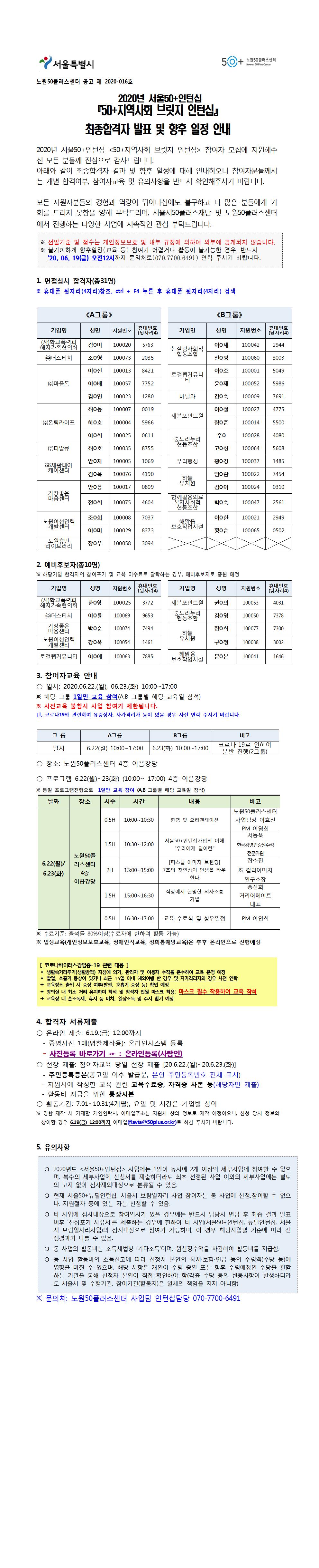 2020년 서울50+인턴십『50+지역사회 브릿지 인턴십』최종합격자 발표 및 향후 일정 안내