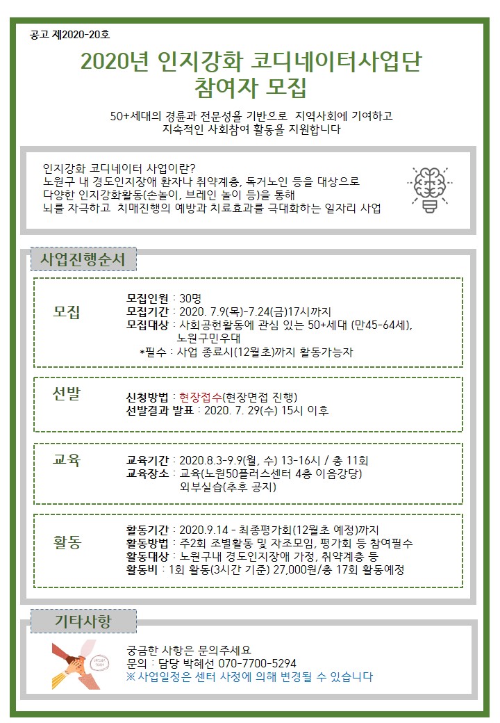 서울시 노원센터 | [모집]2020년 인지강화 코디네이터 사업단 참여자 모집