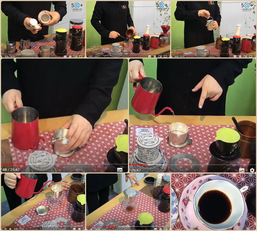드림도구로 핀을 사용해 연유를 넣고 커피를 넣어 추출해 마시는 대표적 베트남 커피 세종류를 만들어보자.