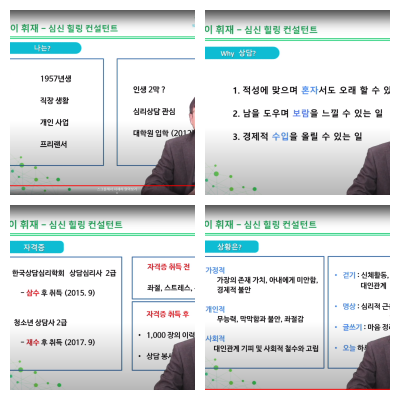 이번 강의는 강사님 자신의 이야기를 통해서 우리들의 답을 찾는데 첫번째 열쇠가 되는 강의로 생각되며, 진솔하고 차분한 강사님의 이야기가 시작됩니다.