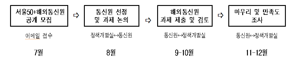 수집하여 정책 수립과 사업 운영에 적극 활용하고자, 해외 네트워크 확대에 중요한 역할을 하게 될『서울50+해외통신원』을 모집합니다.