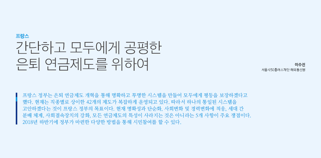 ▶ 프랑스 정부는 직종별로 복잡하고 상이한 은퇴 연금제도를 공통적으로 개혁하겠다고 밝혔다. 기본적으로 제도를 단순화, 공정성, 사회변화에 적응, 안정적인 시스템으로 구비하고자 하는 바이며, 현재는 시민참여 토론 단계에 있다. 시민참여는 2018년 하반기, 정부가 마련한 다양한 토론 창구를 통해 이루어 질 계획이다.